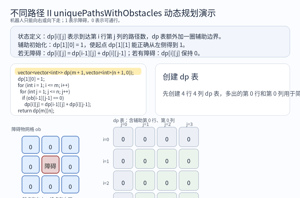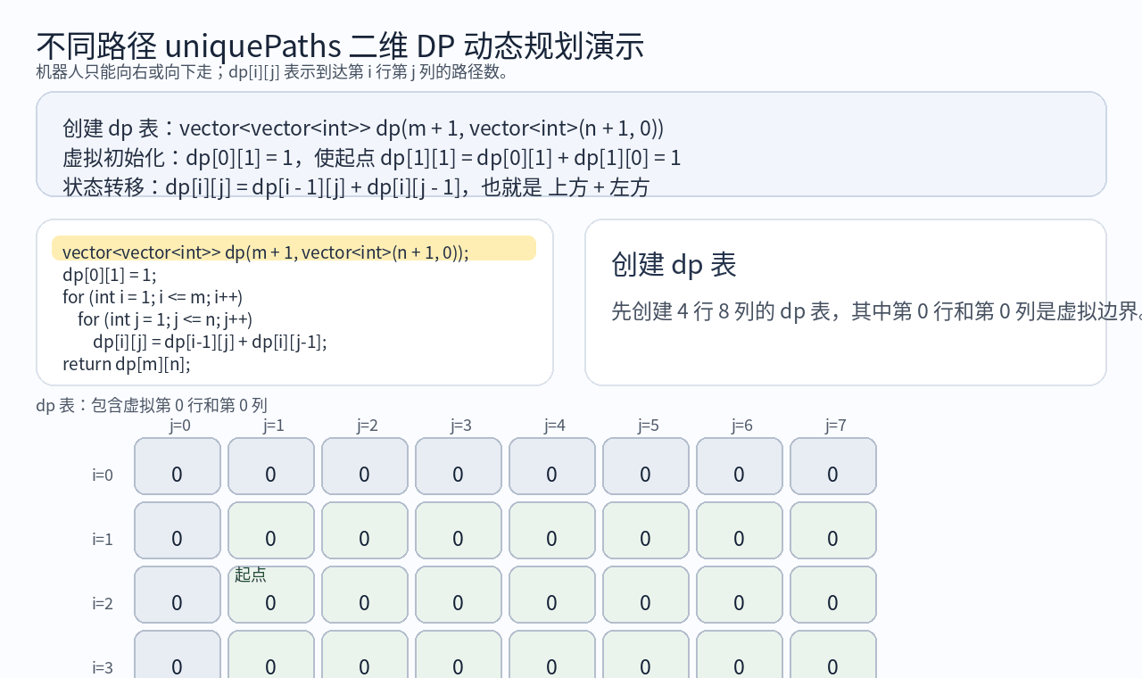 - 状态与状态转移方程:这是把思想落实为代码的关键.状态,就是"到达某个格子时的结果",用dp[i][j]表示.状态转移方程,描述状态之间的关系.以最简单的"不同路径"为例,它就是:dp[i][j] = dp[i-1][j] + dp[i][j-1]