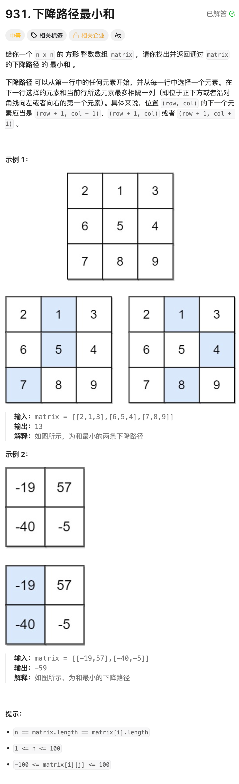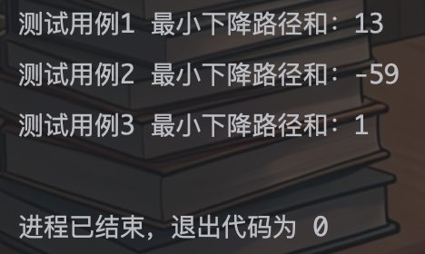 cout << "测试用例3 最小下降路径和:" << sol.minFallingPathSum(test3) << endl;