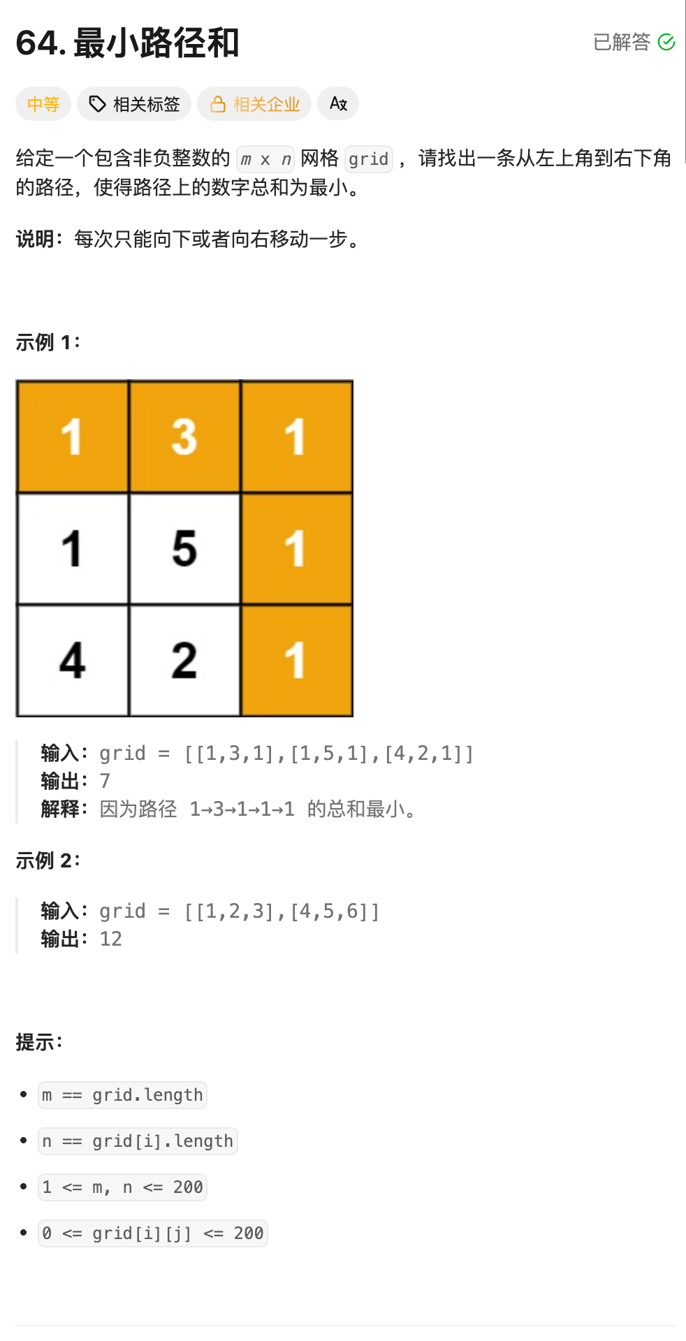 cout << "测试用例3 最小路径和:" << sol.minPathSum(test3) << endl; // 预期结果:6