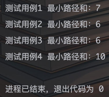 cout << "测试用例4 最小路径和:" << sol.minPathSum(test4) << endl; // 预期结果:10