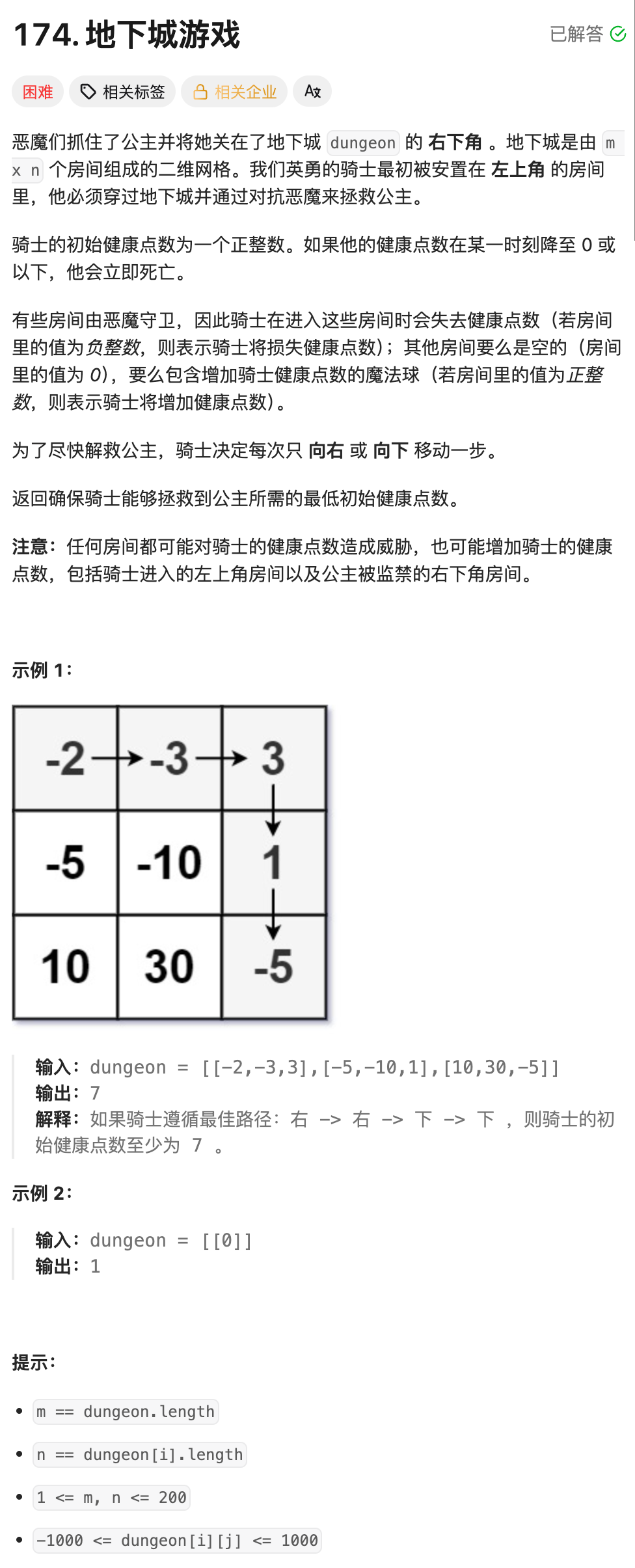 [i, j]位置的时候,所需的最低初始健康点数.那么我们分析状态转移的时候会有一个问题:那就是我们当前的健康点数还会受到后面的路径的影响.也就是从上往下的状态转移不能很好地解决问题.