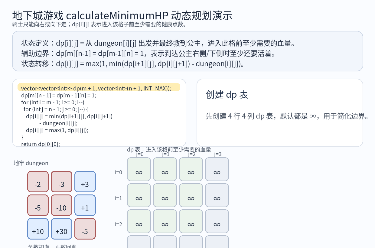 dungeon[i][j]是一个比较大的正数的话,dp[i][j]的值可能变成 0 或者负数.也就是最低点数会小于1,那么骑士就会死.因此我们求出来的dp[i][j]如果小于等于 0 的话,说明此时的最低初始值应该为1.处理这种情况仅需让dp[i][j]与 1 取一个最大值即可: