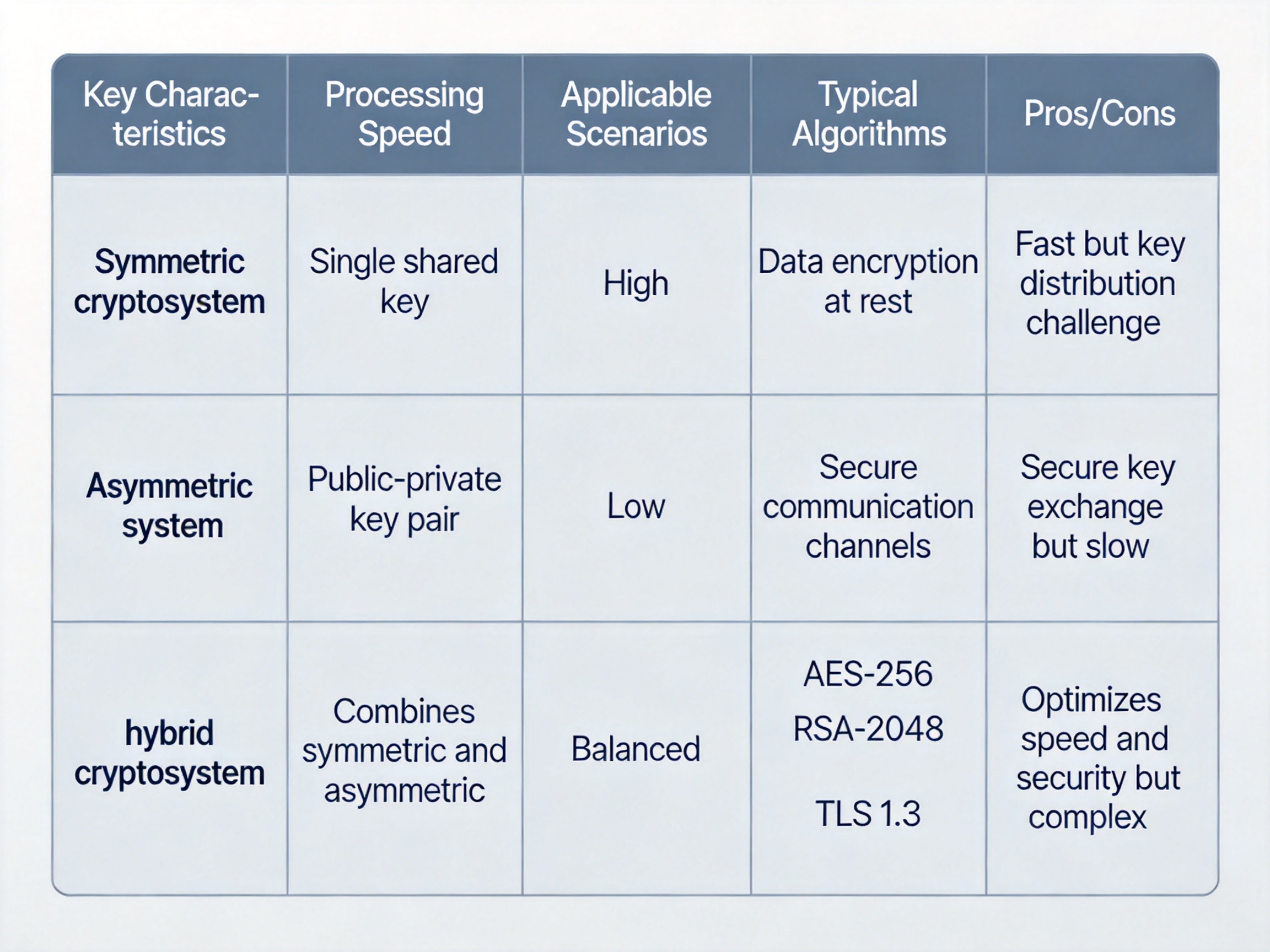 三类密码体制技术特性对比表,包含密钥特性、速度、适用场景、典型算法、优缺点等维度