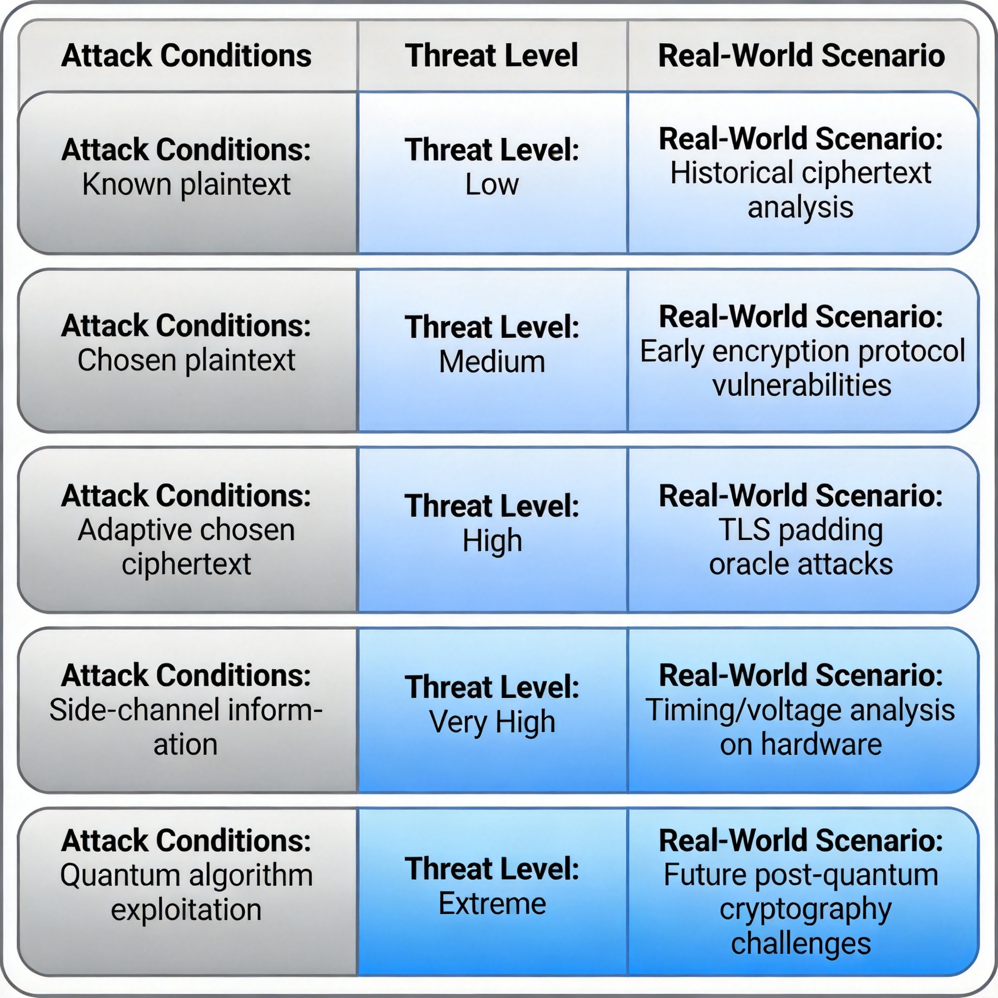 五类密码分析模型的攻击条件、难度对比与典型场景示意图