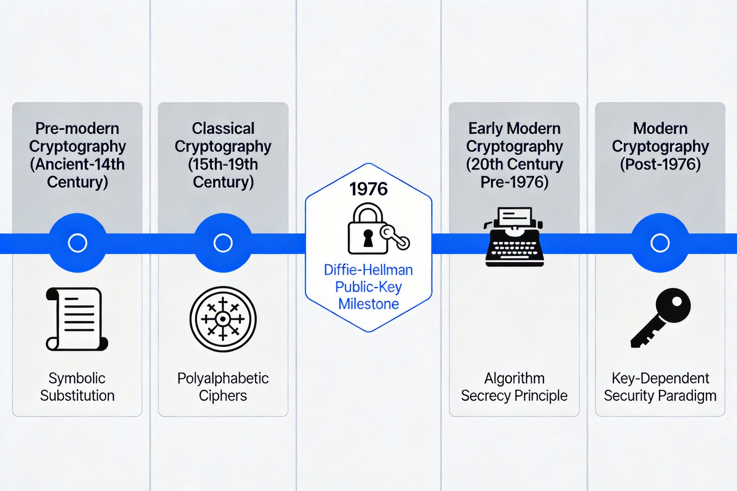 - 古典密码阶段(1949 年之前):以替换、移位等手工加密方式为主,典型代表为凯撒密码、维吉尼亚密码,安全性依赖算法保密性,无严格的理论支撑。