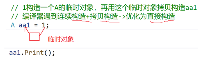 cppclass A { public: A() {} // 无参构造 }; int main() { A obj = 10; // ❌ 报错! // 没有 A(int) 构造函数 → 不能隐式转换 } class A { public: // 构造函数explicit就不再⽀持隐式类型转换 // explicit A(int a1) // 单参数构造函数(int 类型) A(int x) { val = x; } int val; }; int main() { // 隐式转换!!! // 把 int 10 自动 → 变成 A 对象 A obj = 10;// 编译器遇到连续构造+拷⻉构造->优化为直接构造 // 等价于 A obj(10); }• 类类型的对象之间也可以隐式转换,需要相应的构造函数⽀持