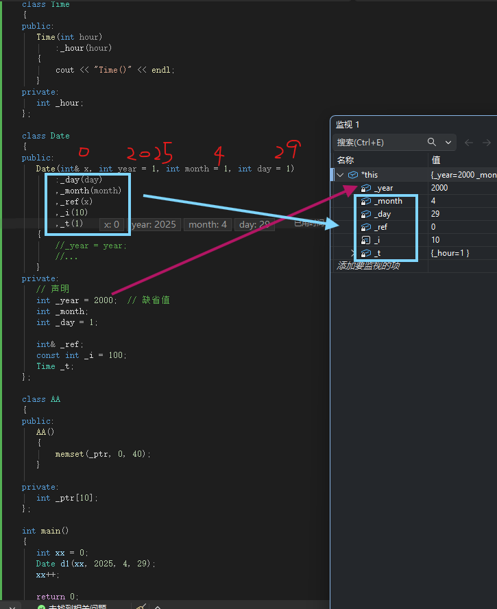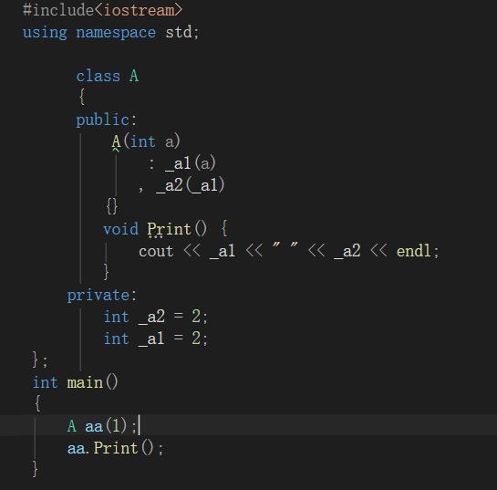cppclass A{ public: // 全参带默认值 → 是默认构造 A(int x = 10){} // 普通有参构造,无默认值 A(int a){} }; class B{ A a; // 自定义成员,未写初始化列表 public: B(){} // 合法:自动调用 A::A(int x=10) };• 初始化列表中按照成员变量在类中声明顺序进⾏初始化,跟成员在初始化列表出现的的先后顺序⽆关。建议声明顺序和初始化列表顺序保持⼀致。