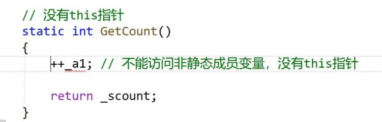• 静态成员函数中可以访问其他的静态成员,但是 不能访问⾮静态 的,因为没有this指针。