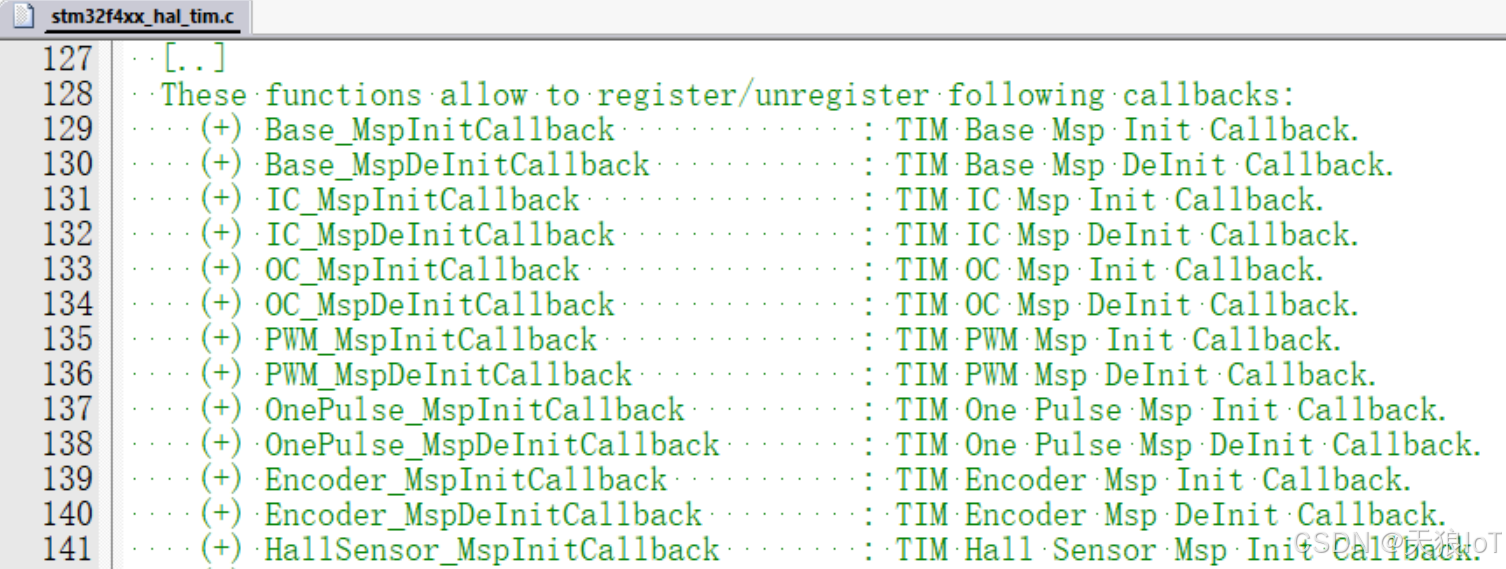 各外设中断的回调函数名(Callback函数)可以在 "stm32xxx_hal_xxx.c"文件的代码生成日志中查看,以"stm32f4xxx_hal_tim.c"为例,如下所示。