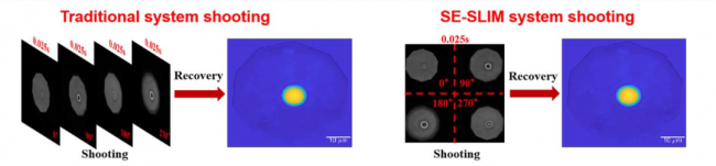 传统SLIM系统需要四次独立的相机曝光才能获取一组完整的四步相移数据,Gloria 4.2 sCMOS相机单次触发即可完成四通道同步采集,较传统SLIM系统时间分辨率提升4倍,实现时间维度上的统一采样。图1为传统SLIM与SE-SLIM数据获取方式对比。