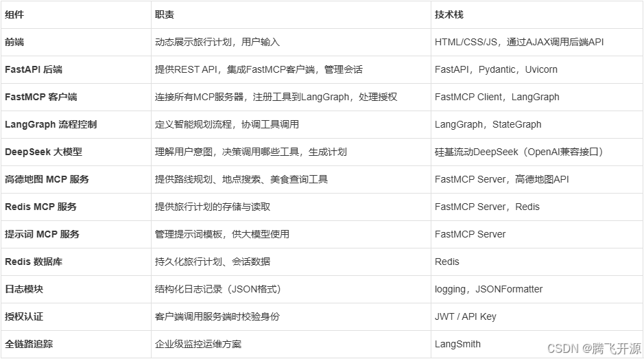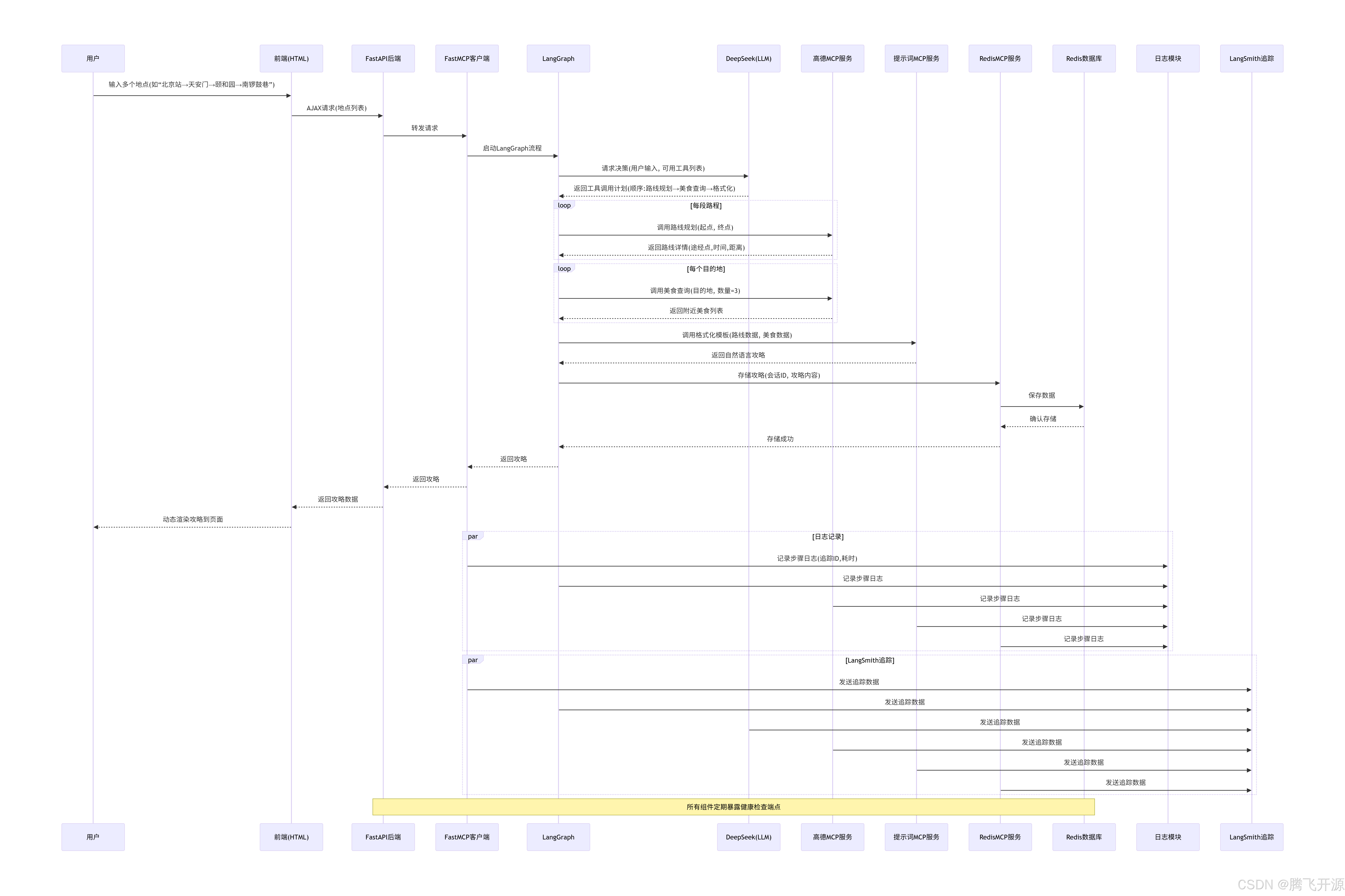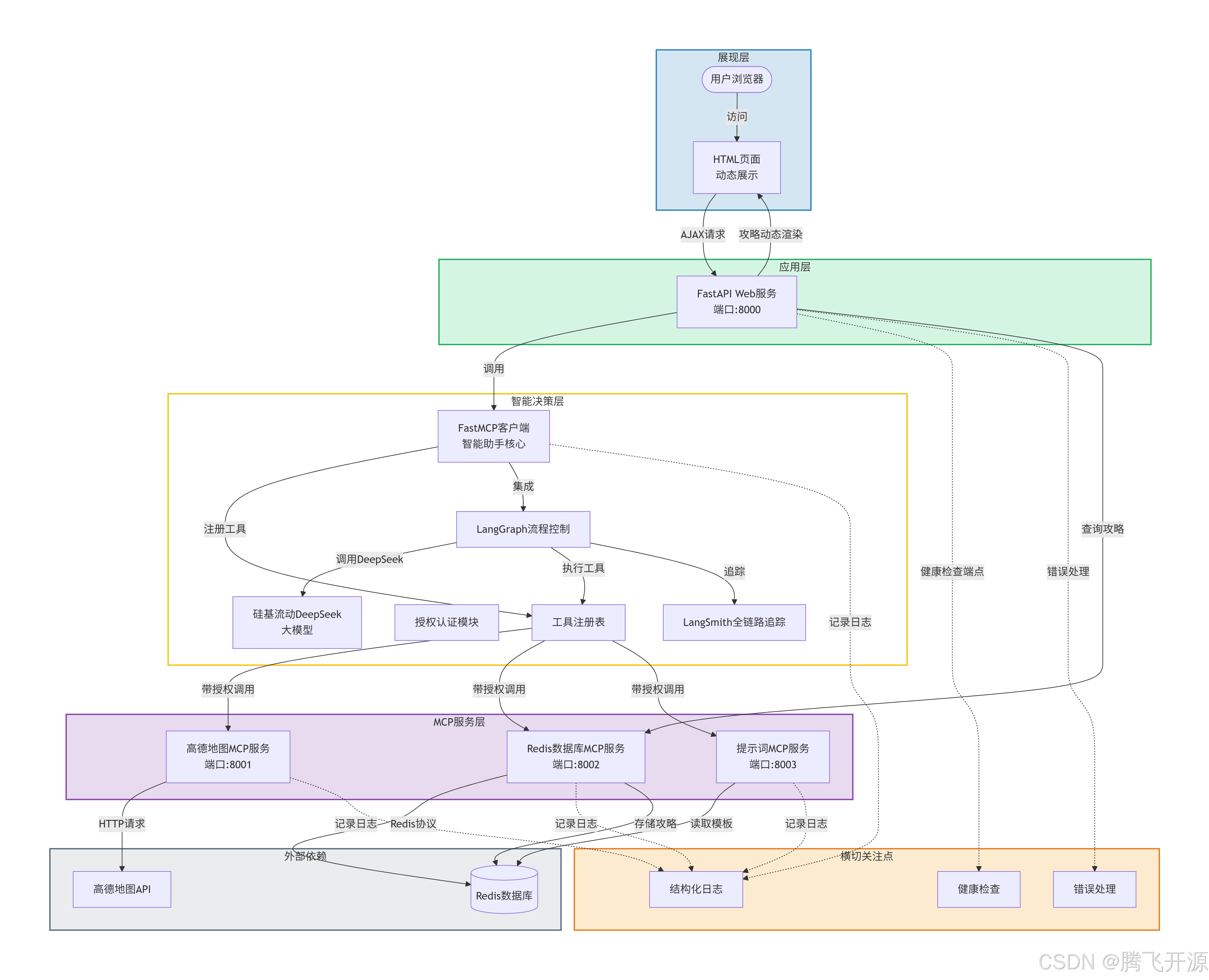 本文介绍了一个基于微服务架构的旅游出行攻略智能助手系统。系统分为前端展示层、API接入层、智能决策层、MCP服务层和外部依赖层,各层职责明确,通过FastMCP协议通信,LangGraph负责流程编排,DeepSeek驱动工具调用决策。核心组件包括FastAPI主应用、三个独立FastMCP服务端(高德地图、Redis、提示词)及前端页面。交互流程:用户输入多个地点,主应用启动LangGraph流程,DeepSeek决策调用顺序------先调用高德MCP获取路线规划与美食推荐,再调用提示词MCP格式化攻略,最后通过Redis MCP持久化存储。系统具备健康检查、结构化日志、LangSmith全链路追踪等生产级特性,确保高内聚低耦合、易部署与扩展。
