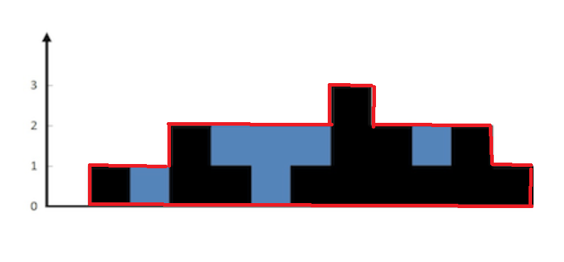 如图所示,只需先统计红色圈起来的"金字塔区域的全部方块",再减去黑色方块,得到的就是最终所需要的水量,我们将增减放到同一个循环中就可以简写为water += leftMax(rightMax) - height[i];