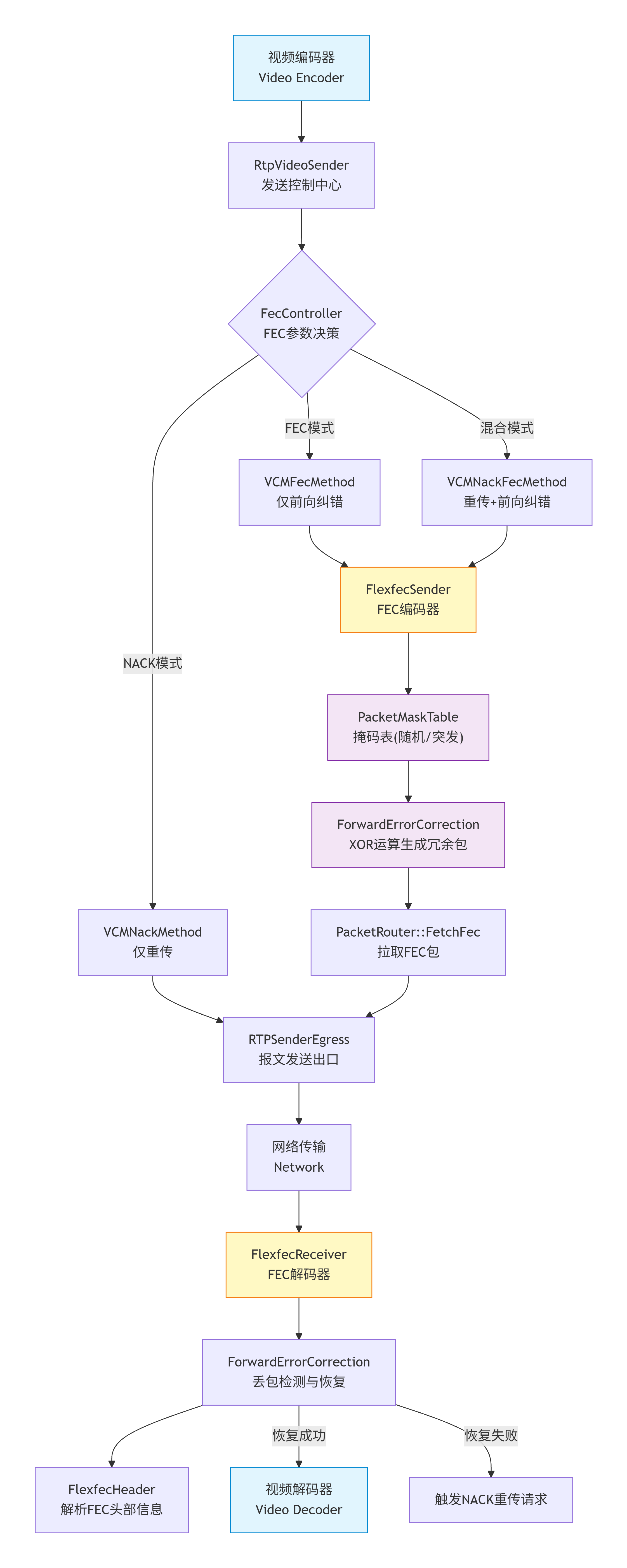 下图详细展示了FlexFEC在WebRTC中的完整处理流程及各模块间的交互关系: