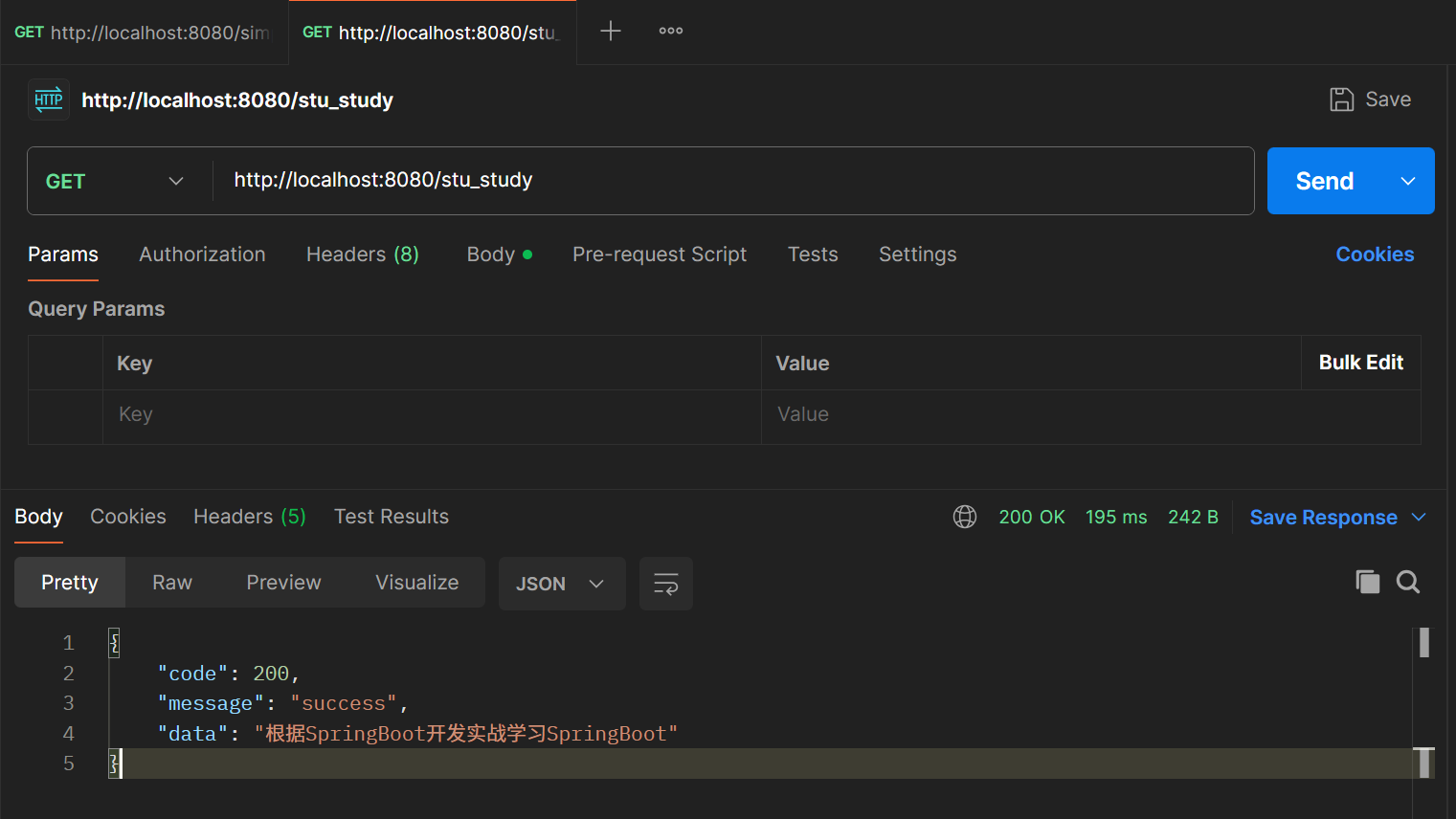 return Result.success( "根据SpringBoot开发实战学习SpringBoot");