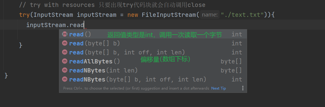 | int | read(byte[] b) | 最多读取 b.length 字节的数据到 b 中,返回实际读到的数据;-1 代表已经读完了 |