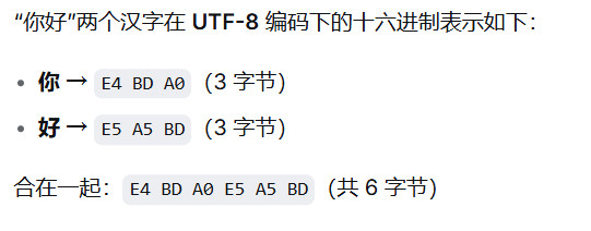 如果文件中包含 非 ASCII 字符(如中文 "你"、"好"、表情符号等),这些字符在 UTF-8 编码下通常占多字节