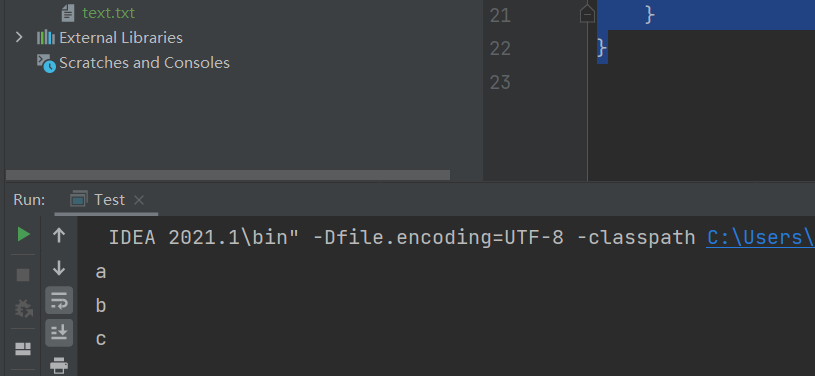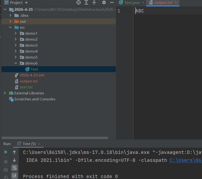 运行结果:新建了一个output.txt文本文件并写入了abc
