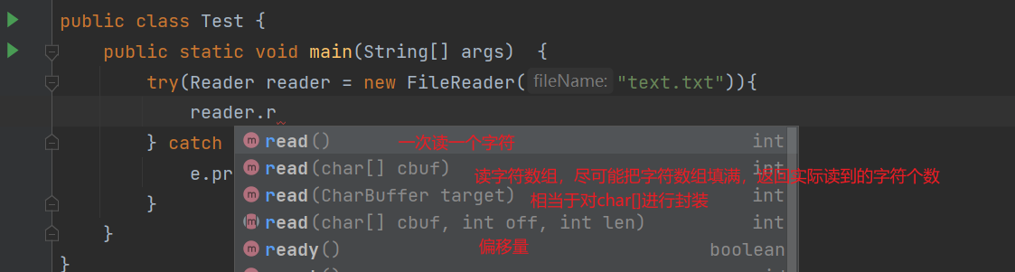 | int | read(byte[] b, int off, int len) | 最多读取 len - off 字节的数据到 b 中,放在从 off 开始,返回实际读到的数据;-1 代表已经读完了 |