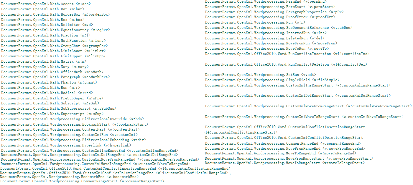 Openxml中Body类是文档根元素类Document的重要属性类,包含文档所有正文内容(段落、表格、图片等),该类型支持添加下图所示的几十种子类型。本文学习其中的Paragraph类的主要属性。