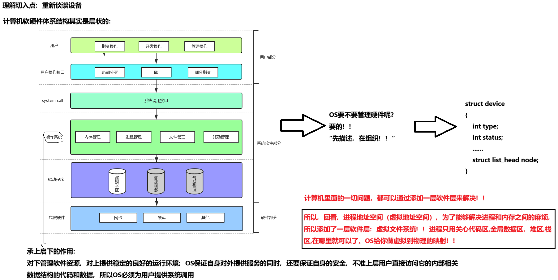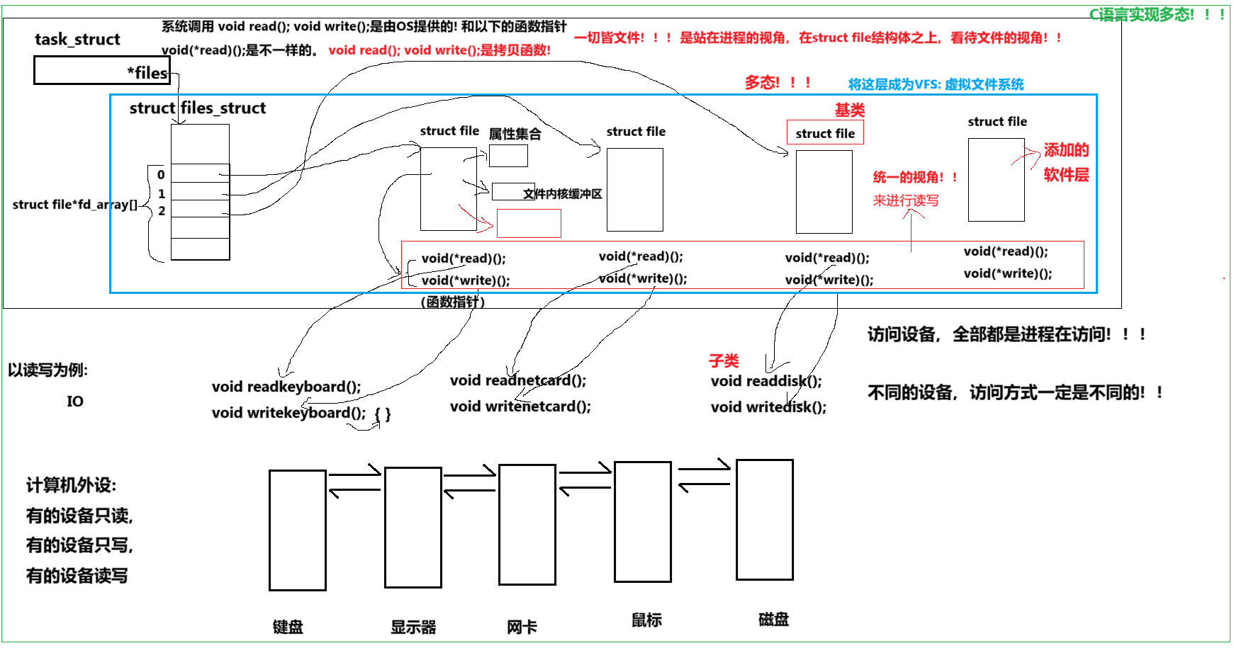 这样的好处是:**开发者需要一套 API 和开发工具,即可调取 Linux 系统中绝大部分的资源。****(也就是有了一套封装继承多态的体系,访问所有的方法时,使用的都是基类的所有的方法就可以完成所有设备的访问,因为基类指向不同的子类就调用子类不同的方法)**例如:Linux中几乎所有的读(读文件,读系统调用,读PIPE)的操作都可以用 read 函数来进行;几乎所有的更改(更改文件,更改系统参数,写PIPE)的操作都可以用 write 函数来进行。