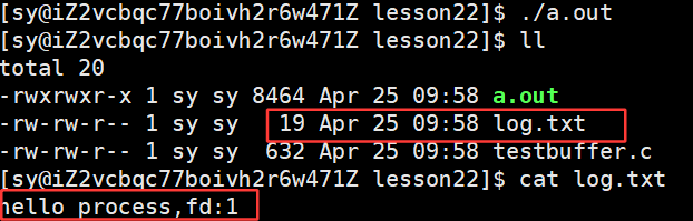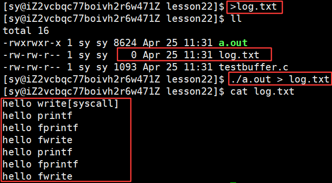 但是当我们将 log.txt 文件中的内容清空时,再次编译,将./a.out里面的内容重定向到 log.txt 时,查看 log.txt 文件内容,此时运行出的结果不一样: