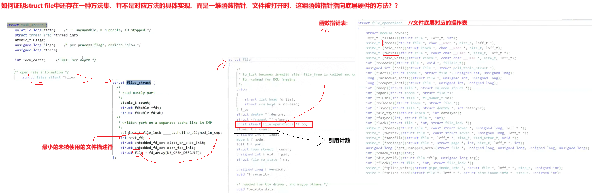 值得关注的是,struct file中 的 f_op 指针指向了一个file_operations 结构体出来,这个结构体中的成员除了 struct* owner 其余的都是**函数指针。**该结构和 stuct file 都在 fs.h下。