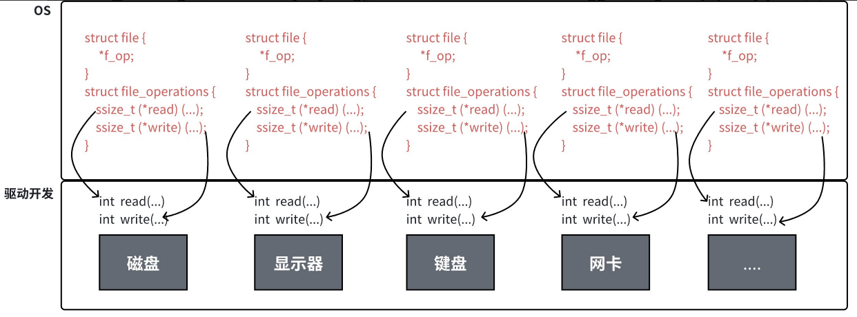 上图中的外设,每个设备都可以有自己的 read、write,但不一定对应着不同的操作方法!!但通过 stuct file 下 file_operation 中的各种函数回调,让我们开发者只用file便可调用 Linux 系统中绝大部分的资源!!这便是 "Linux下一切皆文件" 的核心理解。