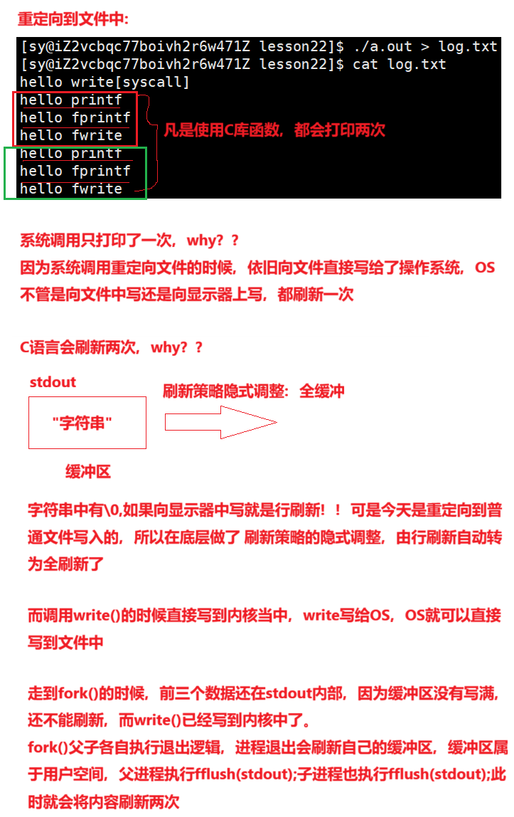 将数据存在缓冲区中,本来应该是在进程退出时进行刷新,但是close(fd);将文件关掉了,关掉了,还往哪里写呢?所以可以看到文件有,但是内容却没有。