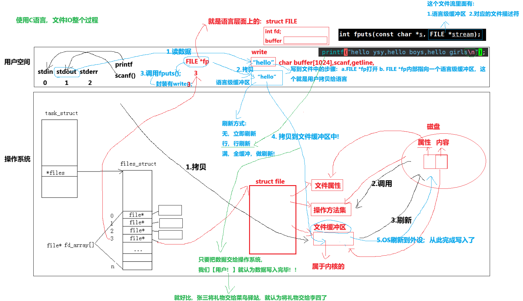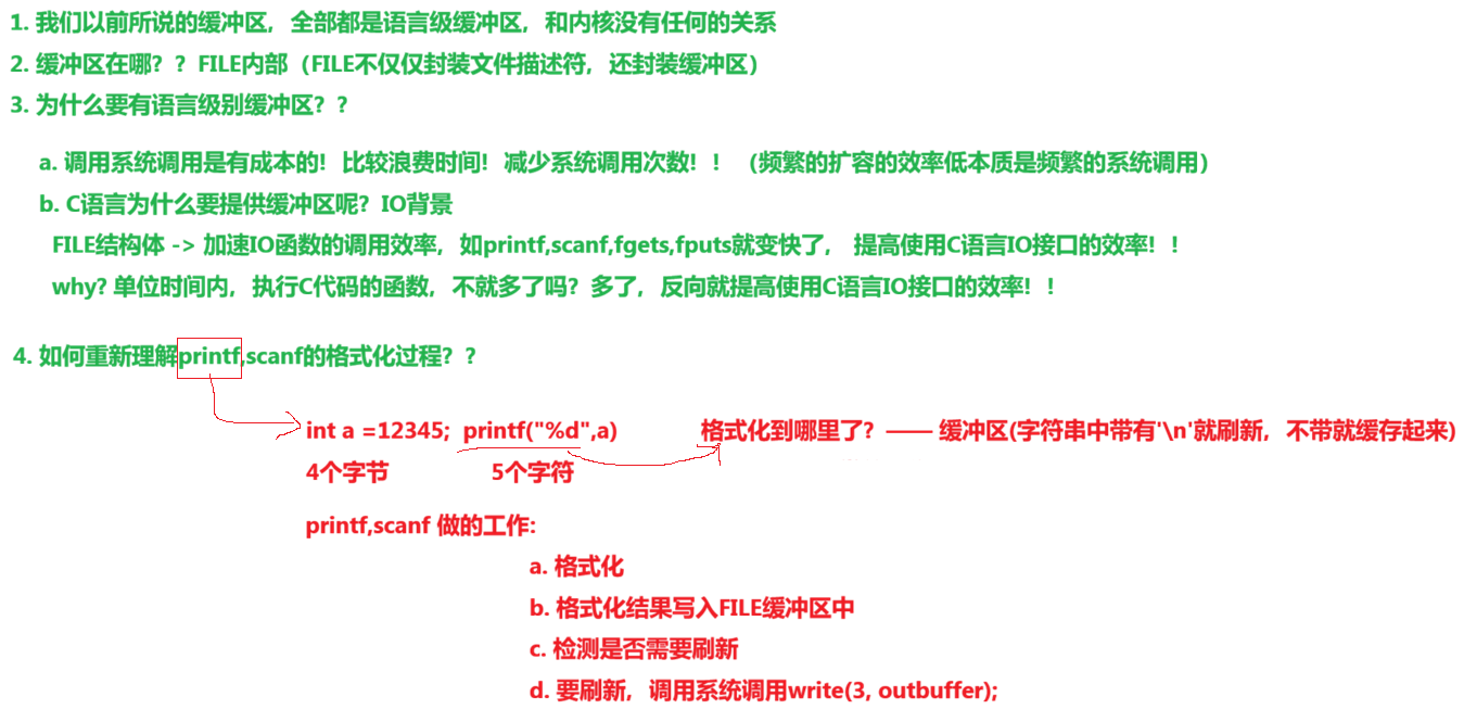 - 全缓冲区:这种缓冲方式要求填满整个缓冲区后才进⾏I/O系统调用操作。对于磁盘⽂件的操作通常使用全缓冲的方式访问。