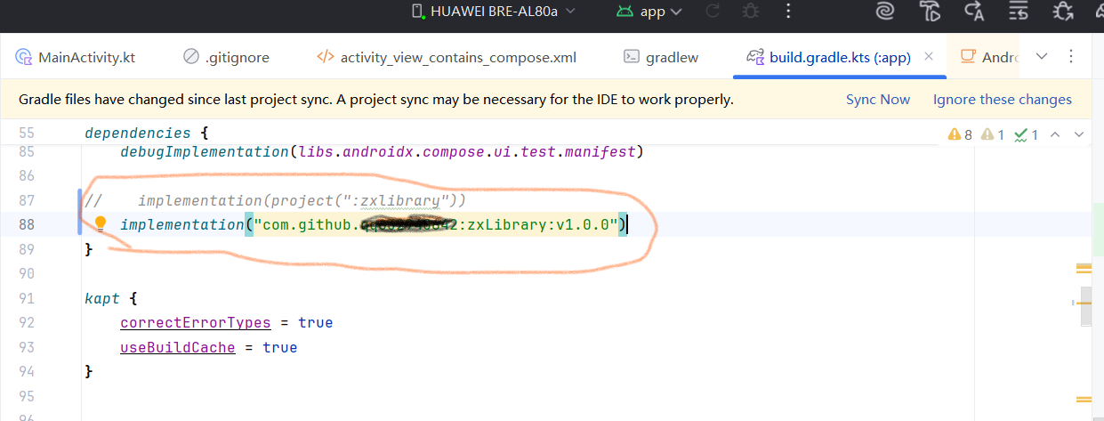 验证下demo,先修改下app/build.gradle.kts 中的依赖,注释掉原来的,改成依赖远程仓库的: