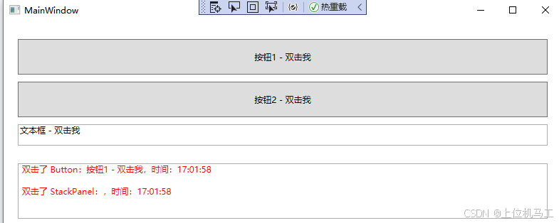 你会发现有richTextbox有两条记录,一个是按钮1被双击了,一个是StackPanel,这是因为附加是冒泡事件,当按钮1被双击以后,冒泡基制也会导致StackPanel作为按钮1的父控件也可以监听到双击事件。
