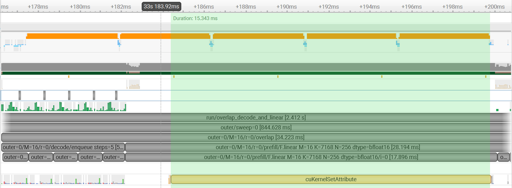 再次用 Nsight Systems 验证:预热阶段出现 cuKernelSetAttribute(此时没有长 kernel 运行,不构成阻塞),正式阶段该 API 完全消失,两个 stream 真正并发。