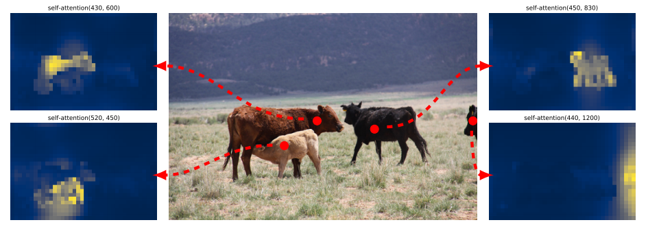 - 解读:解码器注意力非常"局部",只盯着物体的关键点:头、脚、边缘,精准提取边界。