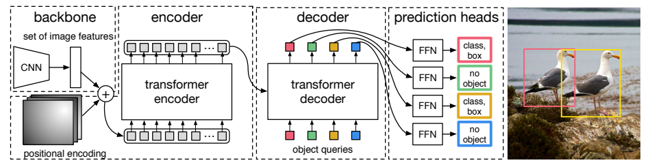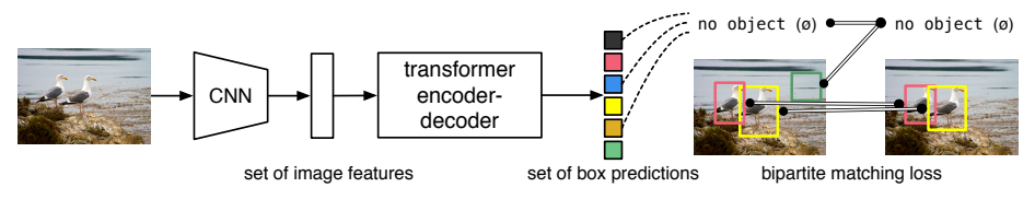 - 图片说明:输入图像 → CNN 提取特征 → Transformer 编码全局信息 → Transformer 解码输出固定数量预测 → 二分匹配损失监督。