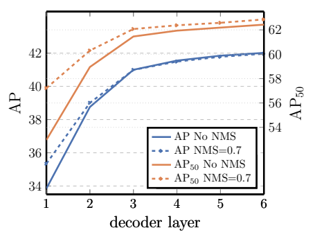 图 4:每个解码器层后的 AP 和 AP50 性能。对单个长计划基准模型进行了评估。DETR 从设计上就不需要 NMS,这一点从该图中得到了验证。NMS 会降低最后几层的 AP,从而剔除 TP 预测,但在第一个解码器层会提高 AP,剔除重复预测,因为第一层没有信息交流,并且略微提高了 AP50。