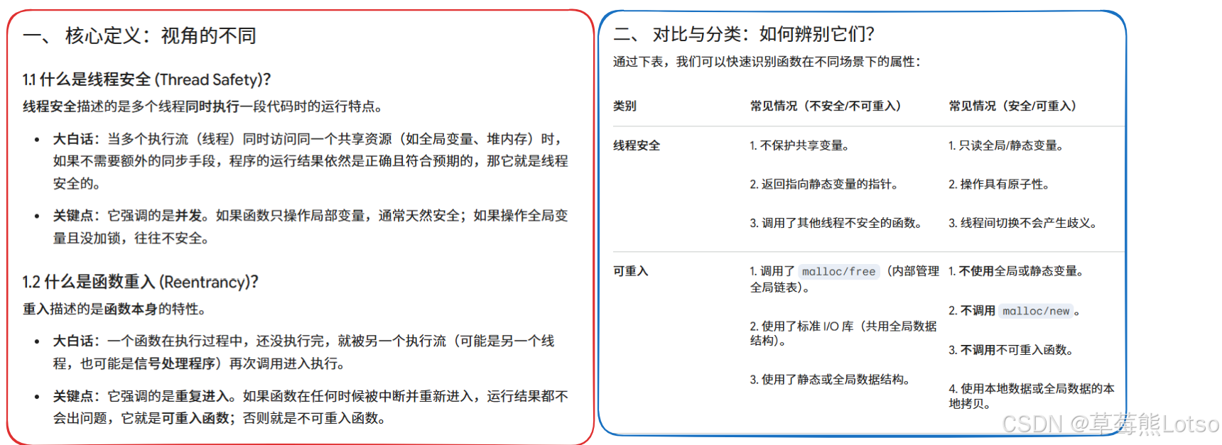- 线程安全描述的是多线程并发访问的运行特性,可重入描述的是函数被重复调用的代码特性;
