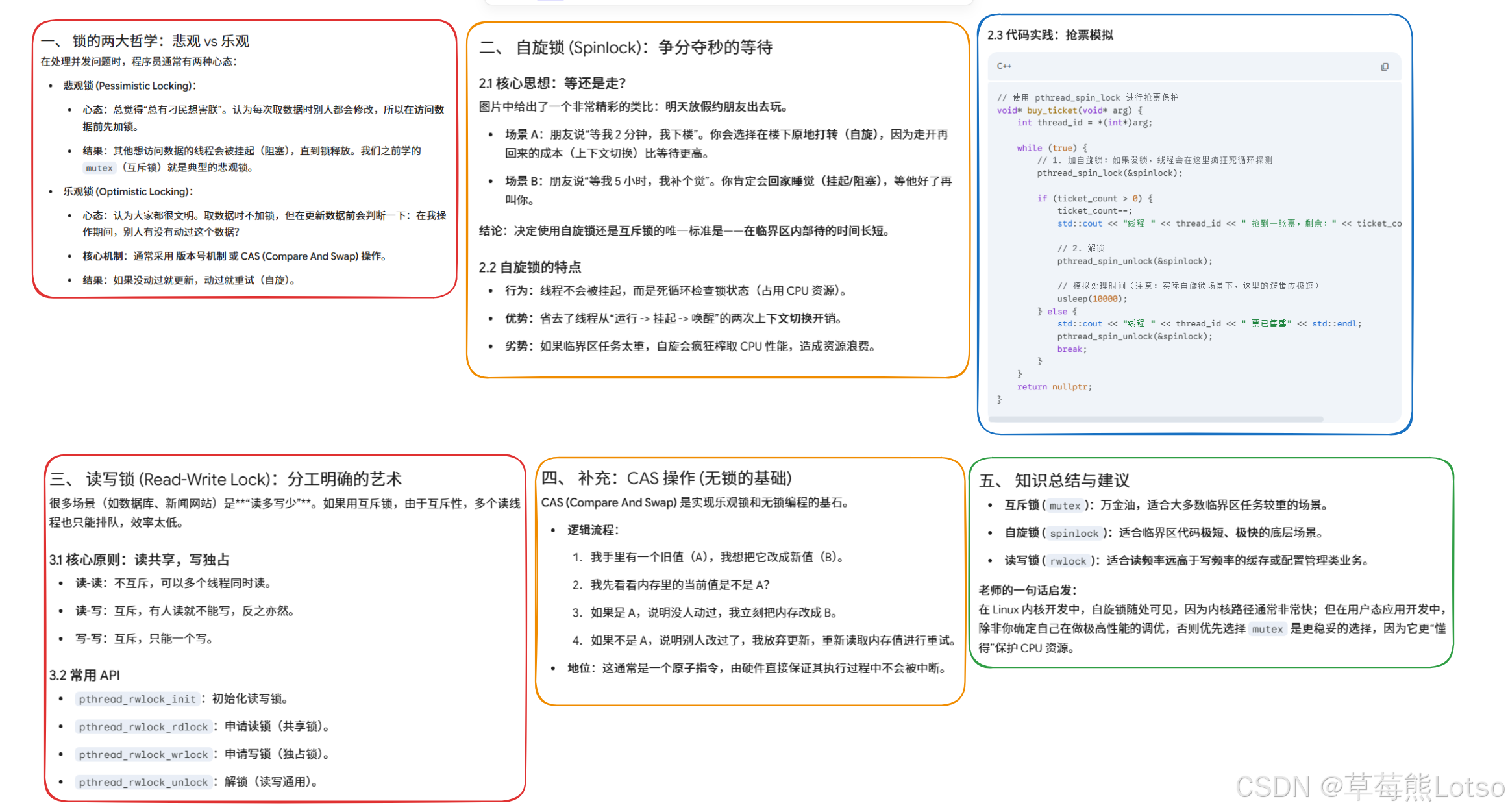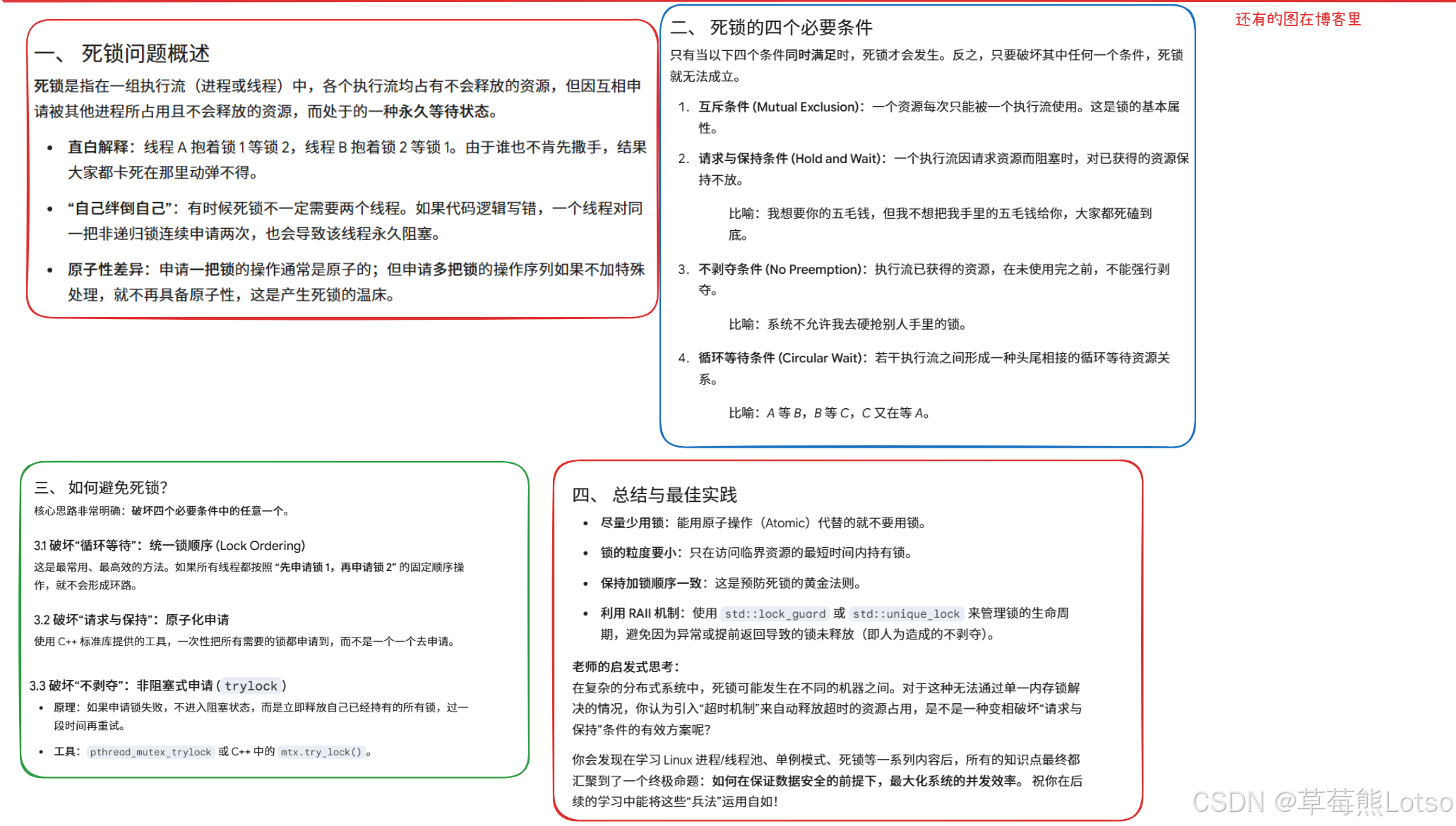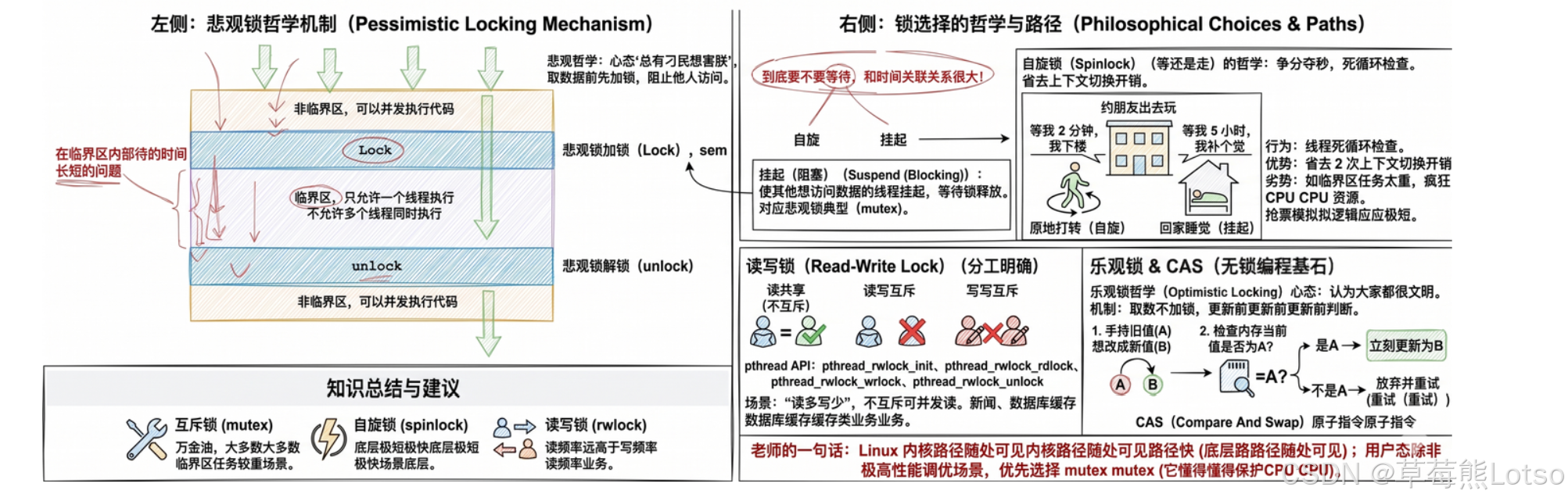 trylock接口; - 代码规范:使用 RAII 风格的锁管理,避免忘记解锁;避免临界区内嵌套加锁;避免临界区内执行耗时操作、调用阻塞函数。