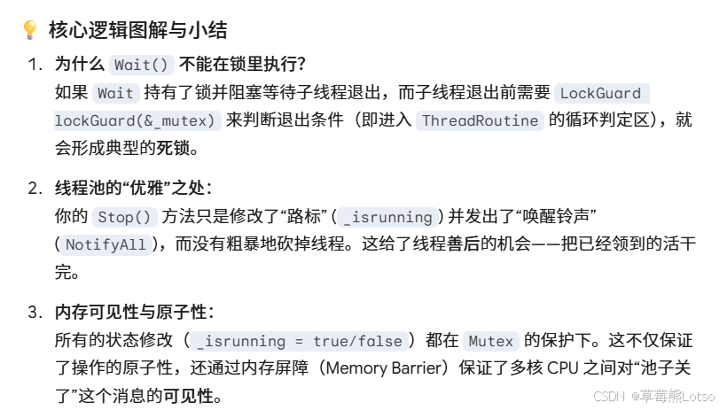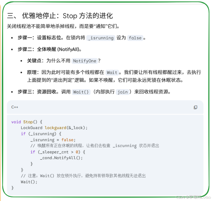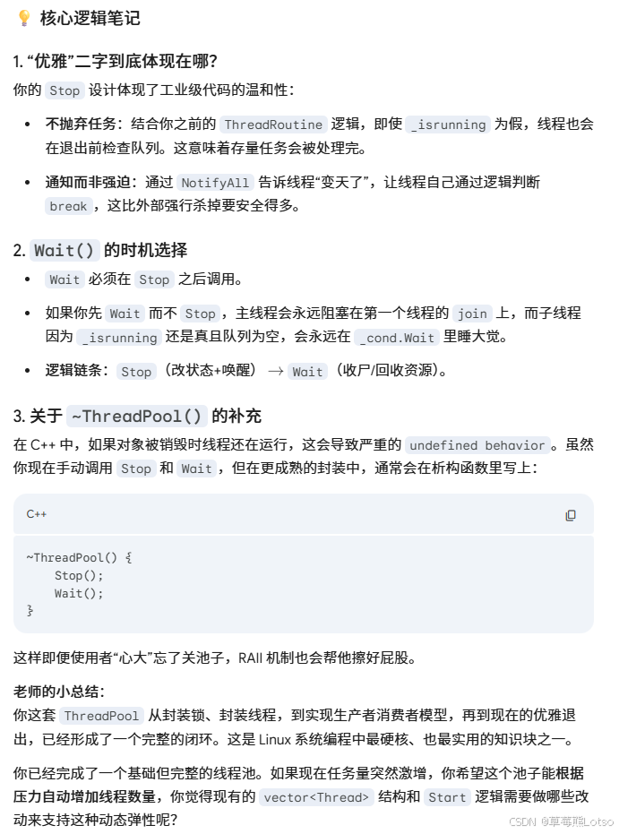 - 优雅退出的双条件判断:只有当「线程池停止运行」且「任务队列为空」时,工作线程才能退出,保证所有已投递的任务都会被执行完毕,不会出现任务丢失;