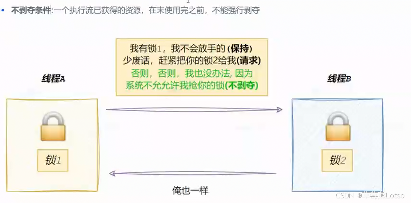 不剥夺条件 :线程已持有的资源,在使用完之前不能被其他线程强行剥夺;