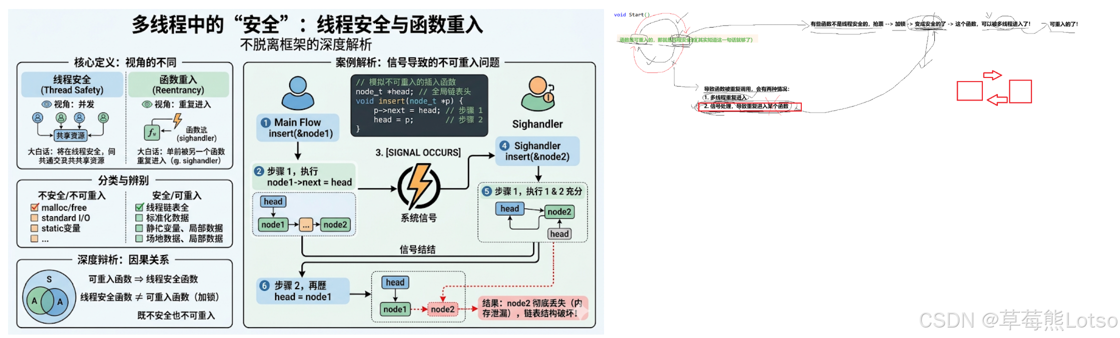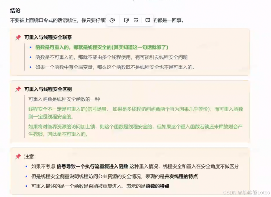 - 可重入函数一定是线程安全的,线程安全的函数不一定是可重入的;