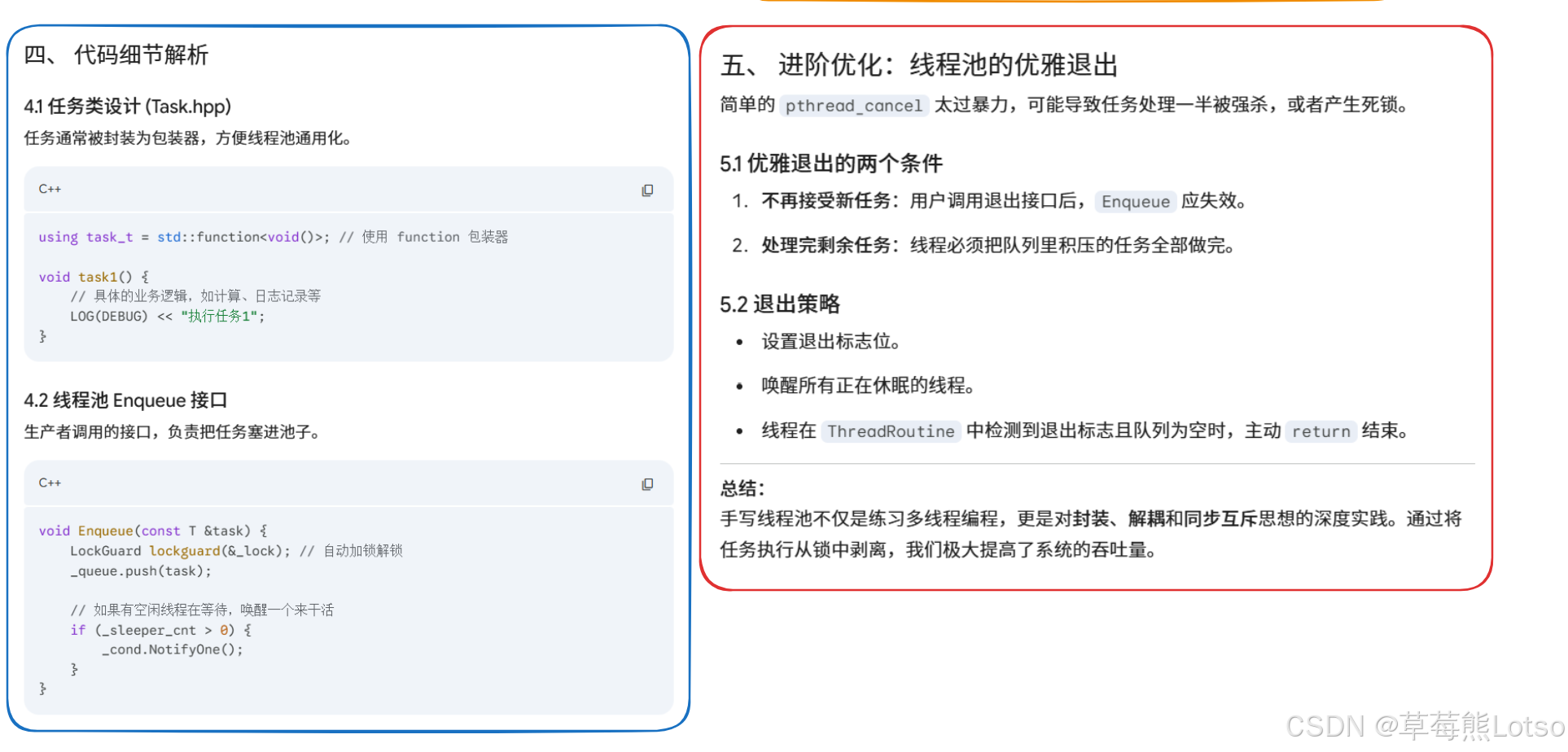 - 任务执行必须在临界区外:工作线程取到任务后立即释放锁,任务执行是线程私有行为,不占用临界区,最大化提升并发度;