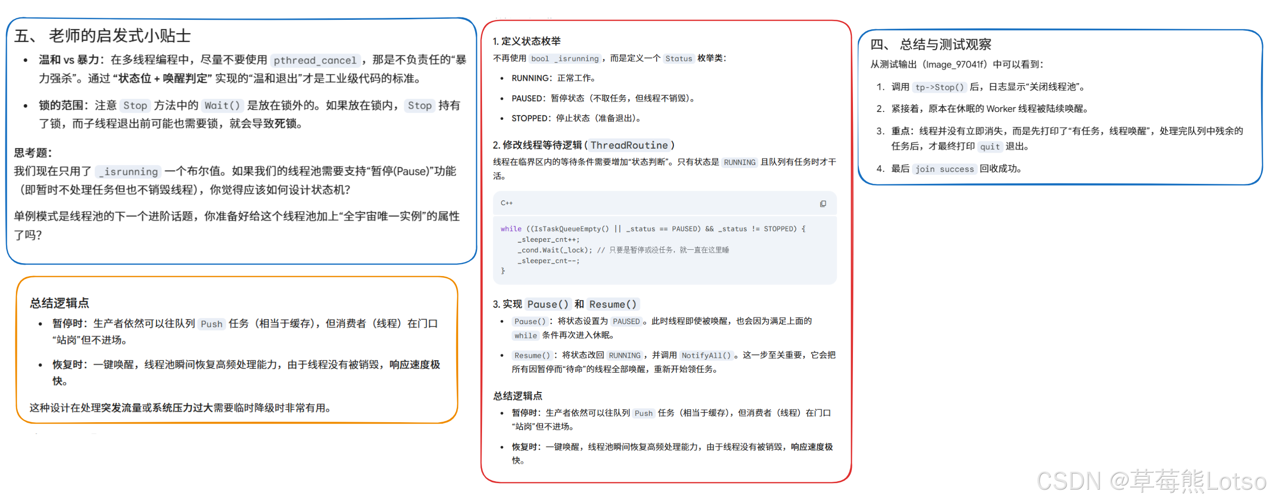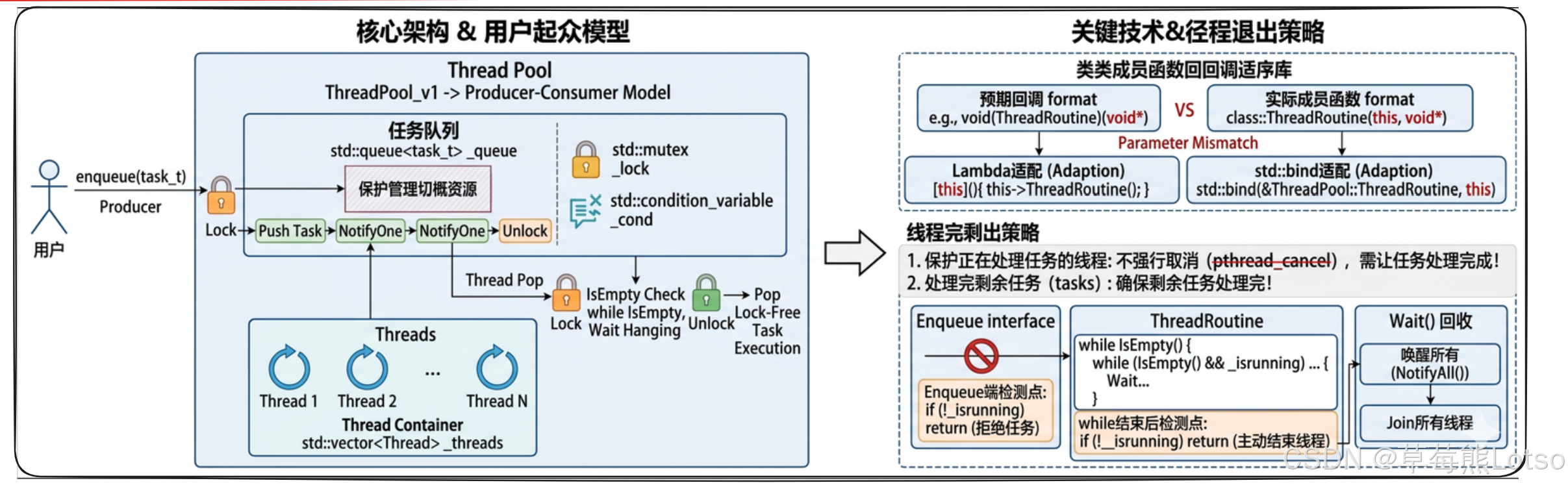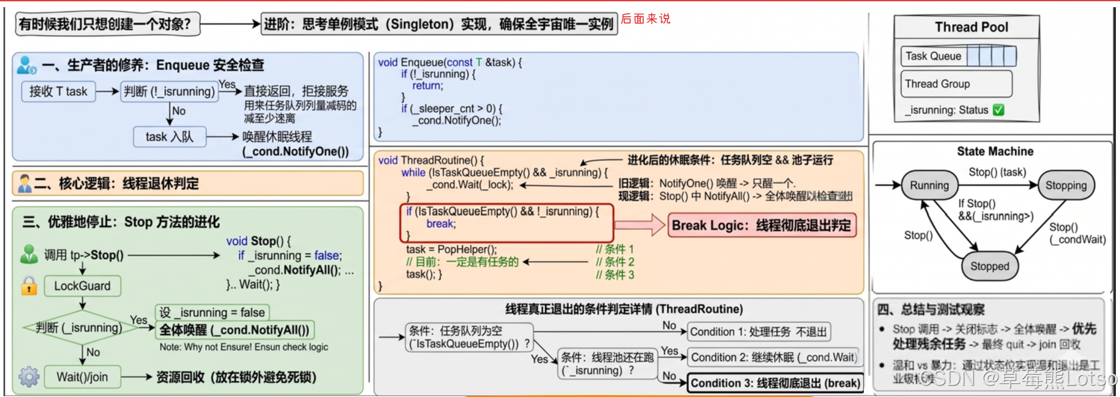 - 优雅退出阶段:设置线程池为停止状态,唤醒所有等待的工作线程;工作线程处理完任务队列中剩余的所有任务后,正常退出;主线程等待所有工作线程回收后,释放线程池资源。