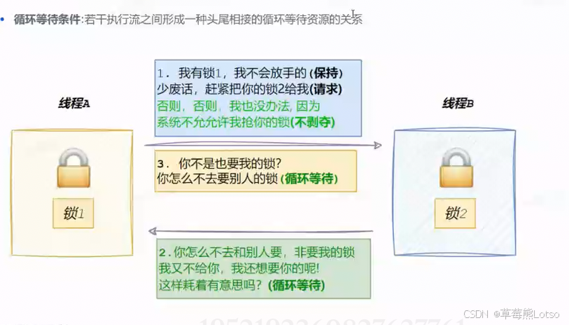 循环等待条件 :多个线程形成头尾相接的循环等待资源的关系。