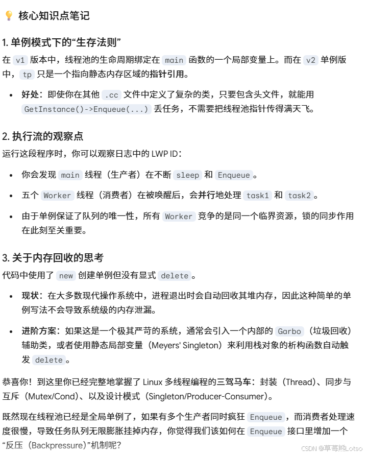 结语:本文从池化技术的核心思想出发,完整讲解了线程池的设计原理,手撕了工业级 C++ 线程池的完整实现,再到单例模式的进阶优化,最后深入拆解了线程安全、死锁、锁机制等底层核心问题,完整覆盖了 Linux C++ 高并发编程中线程池的全链路知识点。线程池是高并发后端开发的基石,它的本质是生产者消费者模型的工程化落地,核心思想是用预申请换响应速度,用统一管理换系统稳定性,用资源复用换系统开销。而线程池的底层,离不开互斥锁、条件变量这些同步互斥原语,更离不开对线程安全、死锁等问题的深刻理解。在实际的工业级开发中,线程池还会有更多进阶优化,比如动态调整线程数量的浮动线程池、任务优先级队列、线程异常处理、监控统计等功能,但核心的设计原理永远不会变。希望这篇文章能帮你彻底掌握线程池,解锁 Linux C++ 高并发编程的核心能力。