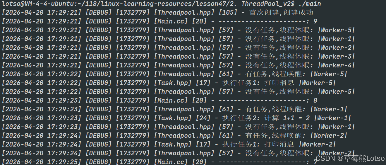 在 Linux 后端高并发开发场景中,我们经常会遇到这样的问题:WEB 服务器每秒要处理上千次客户端请求,日志系统需要异步写入海量数据,批量计算任务需要并行执行。如果每次处理任务都临时创建线程,不仅会带来巨大的线程创建 / 销毁系统开销,还可能因峰值期创建大量线程导致 CPU 调度过载、甚至系统 OOM。池化技术正是为了解决这类问题而生,而线程池就是池化思想在多线程编程中最经典的工程落地。它通过提前创建一批固定数量的工作线程,统一管理任务队列,让用户任务被复用的线程异步执行,从根本上解决了频繁创建线程的开销问题,同时实现了对并发数的精准控制。本文将从线程池的核心原理出发,带你手撕工业级 C++ 线程池的完整实现,再到单例模式的进阶优化,最后深入拆解线程池背后的线程安全、死锁、锁机制等核心知识点,帮你彻底掌握 Linux 高并发编程的这一核心技能。