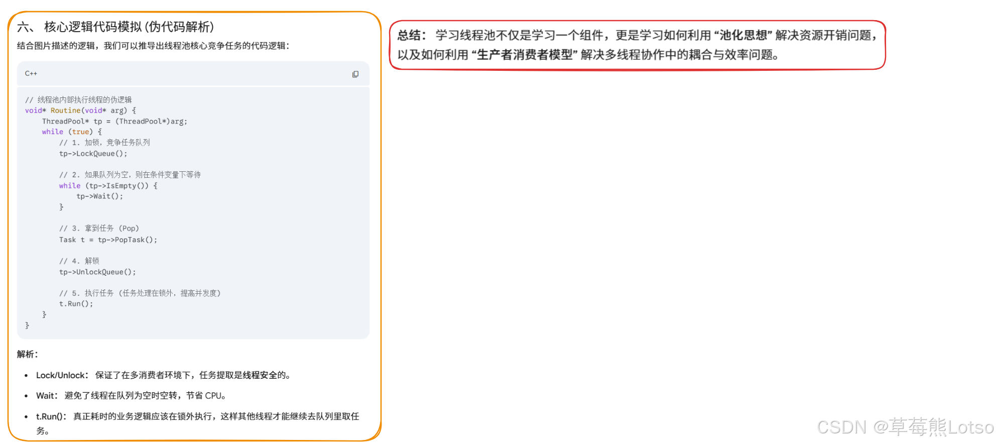 - 条件变量必须用 while 循环判断:防止操作系统的伪唤醒,保证线程被唤醒后一定会重新检查任务队列是否有任务,避免程序异常;