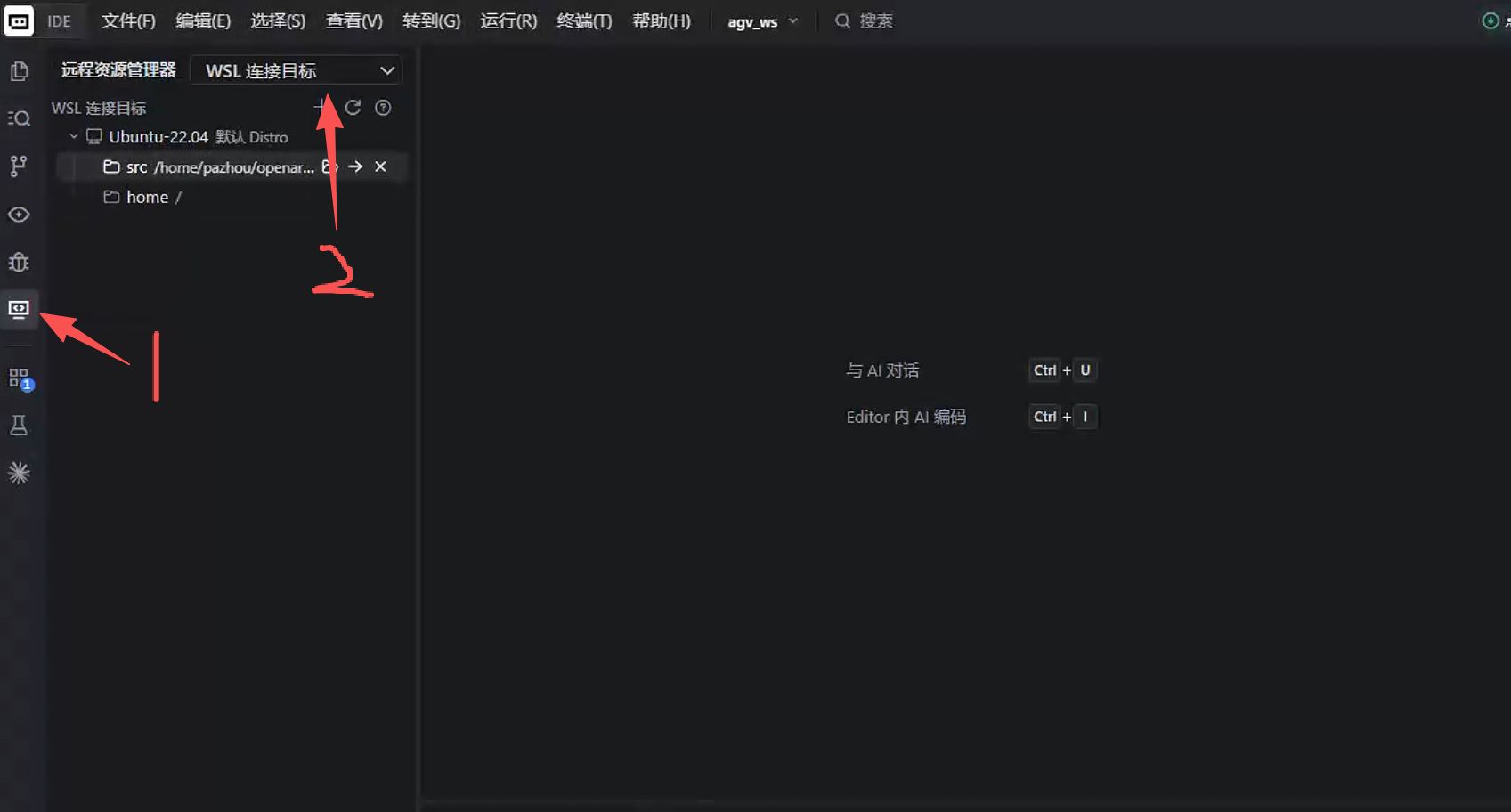 然后按如下图,先点击左侧的远程资源管理器,然后再点击上面选择WSL连接目标,然后选择你自己的ubuntu,进行链接即可。