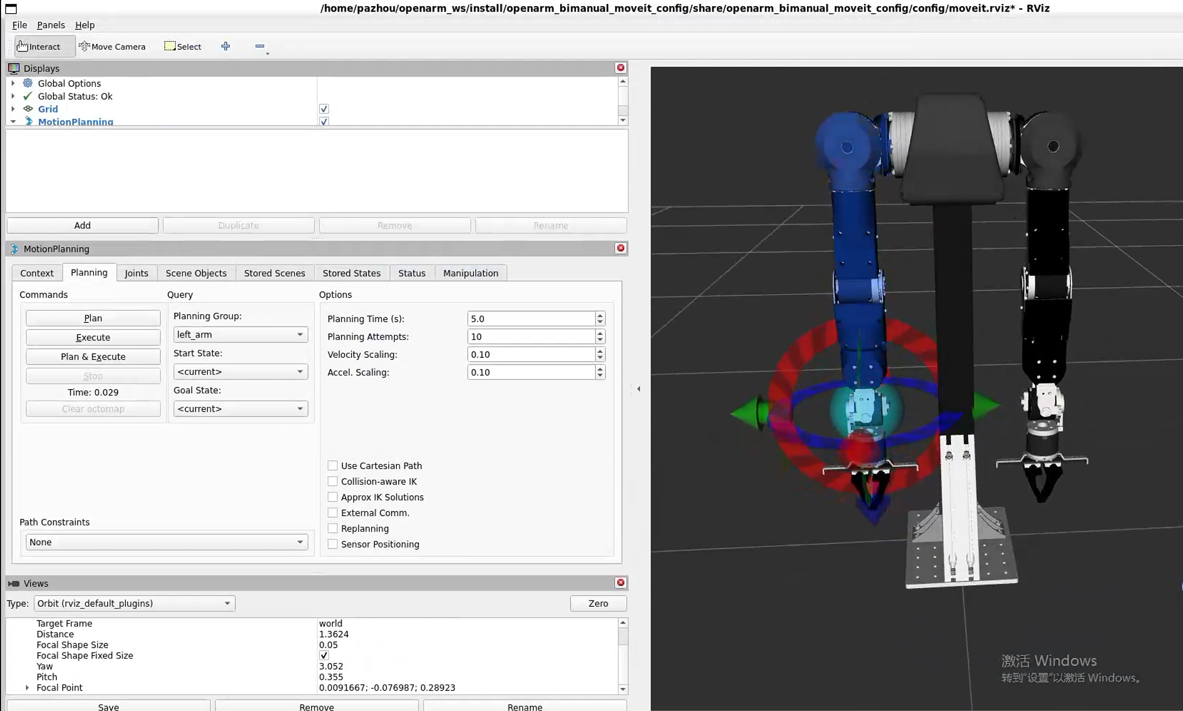 带有一套完整的运动规划框架。可以在 RViz 的 MotionPlanning 面板中直接拖拽双臂的末端进行运动规划与避障: