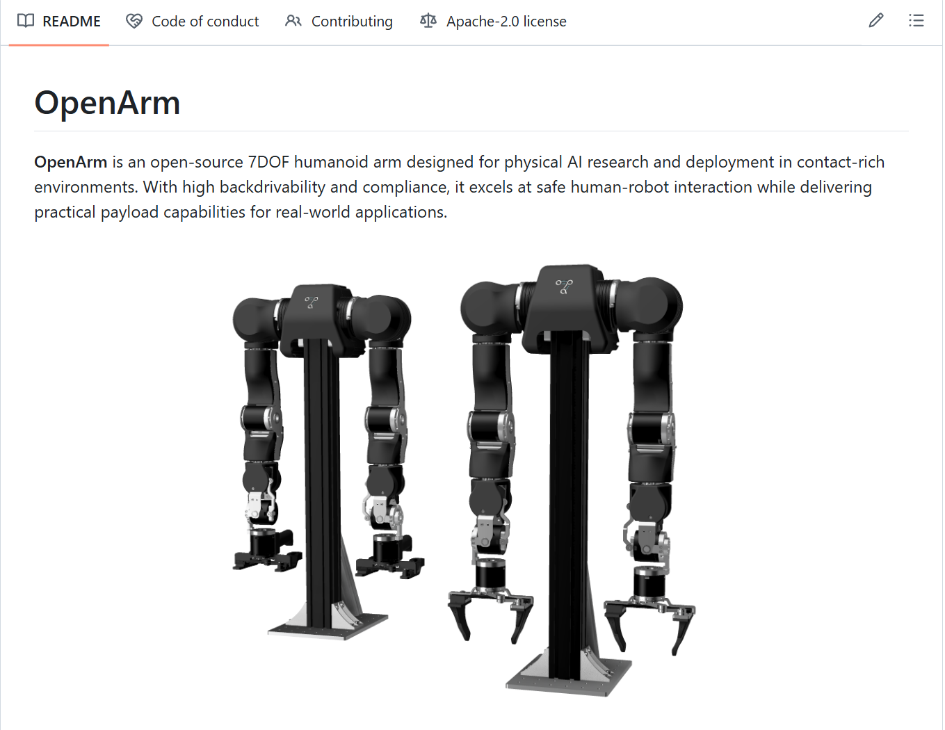 OpenArm 是一个开源的机器人双臂仿真平台,专注于机械臂控制、运动规划及协同操作的模拟与开发。其核心内容包括动力学建模、运动学算法、传感器仿真及多臂协同控制,适用于学术研究、工业自动化测试等场景。