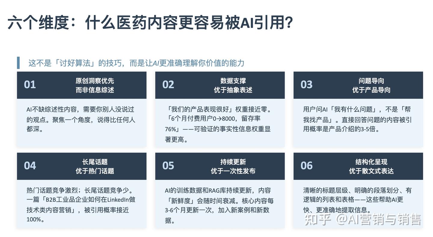 - 问题导向优于产品导向:直接回答患者真实问题的内容被引用概率是产品介绍的3-5倍